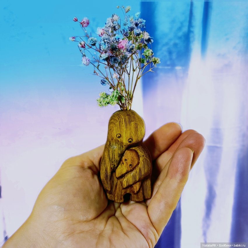 Вот это и вспомнилось мне недавно и очень захотелось вырезать «Под крылышком». Сначала думала просто фигурку, но толщина показалась подходящей под вазочку. И к фигурке добавила отверстие для цветов)