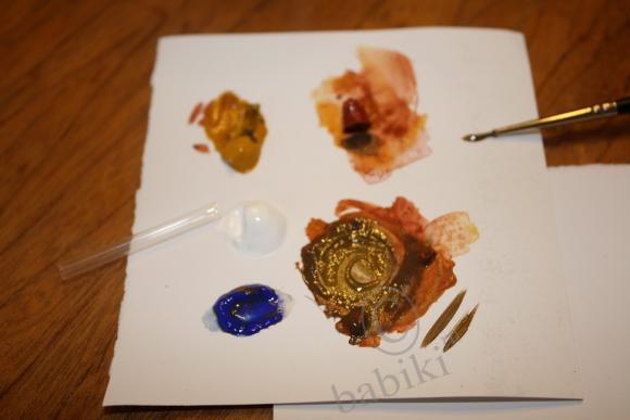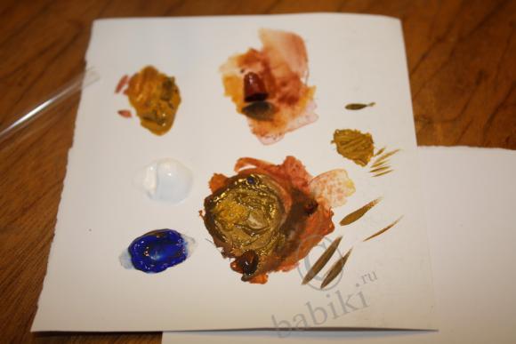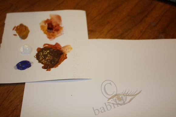 5. Смешиваем краски для второго слоя бровки — мешаем получившийся для «фона» брови цвет с охрой (добавляем чуть-чуть). Проверяем цвет на бумаге (он должен быть где-то на 2 тона светлее):