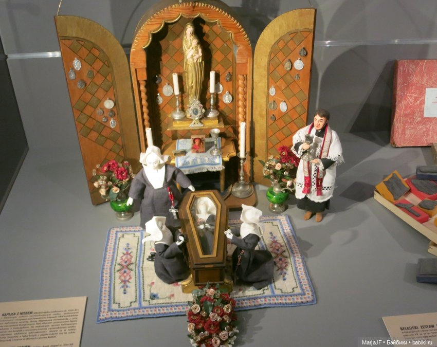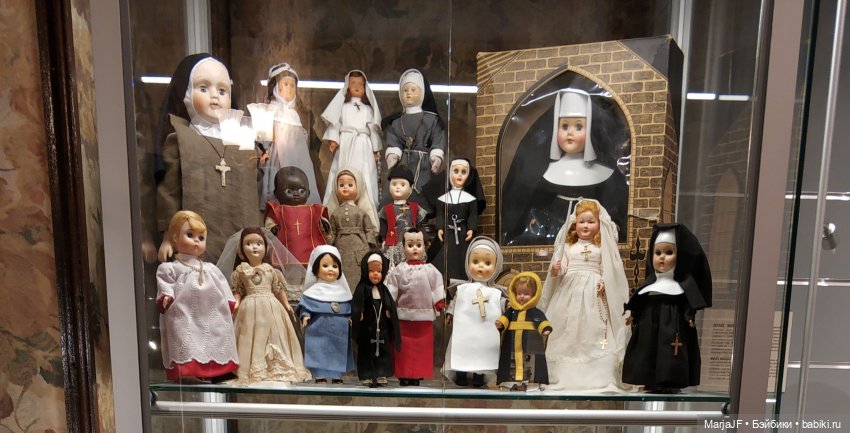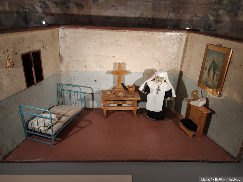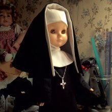 … Когда образ куклы был полностью готов, я поставила её у стены, на своем рабочем столе, светили низко наклоненная настольная люминисцентная лампа и монитор, рядом с куклой. И тут в комнату входит муж, из хорошо освещенного коридора. Я ему показываю на куклу и спрашиваю :«Ну как?». Муж прищурился и наклонился над столом и вдруг кааак отпрыгнет и… перекрестился. Он сперва подумал, что это на мониторе монашка, а когда осознал, что это реальная монашка и тянет к нему руки ( в полумраке чего не привидится 👻), то в первый момент испугался.