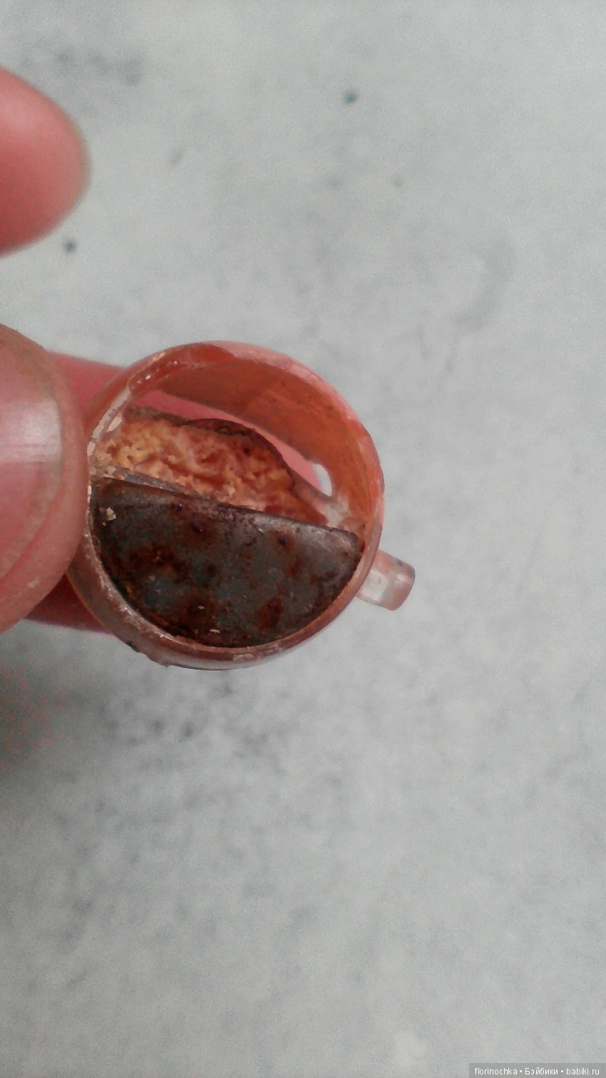 Смотрим дальше, что у нас тут. Глазик с шариком-грузиком, залитый клеем. Шарик стальной, поэтому слегка ржавый уже. Рыхлая ржавчина может проникать сквозь клей и краску, выглядывая желтыми пятнами прямо на лицевой стороне глаза.