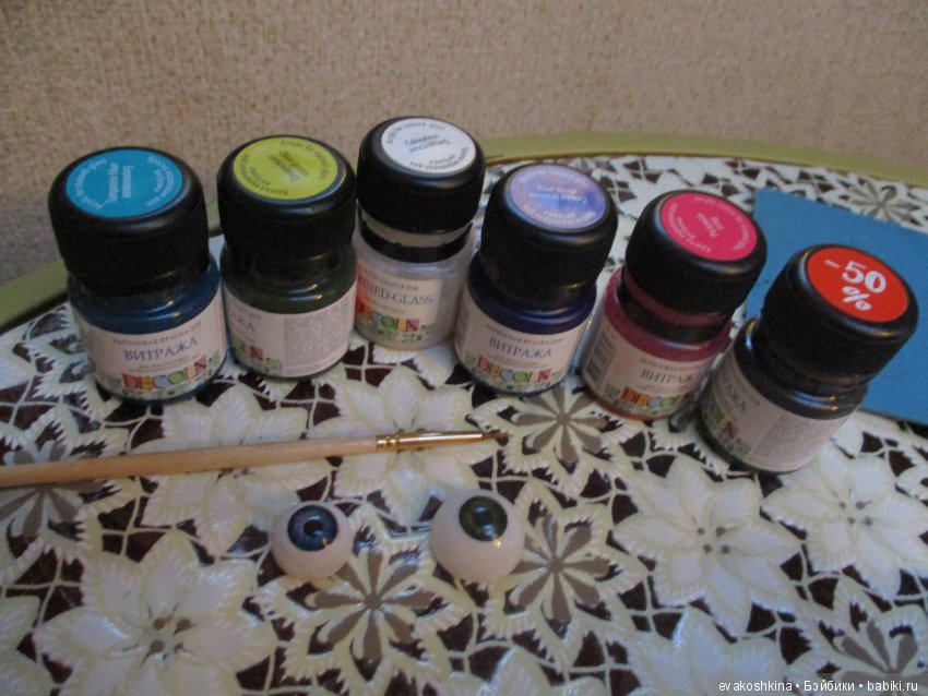 Куклу просто положила горизонтально, и водорастворимой акриловой краской «оливковая» покрыла радужку.Через пять минут она взглянула на меня так