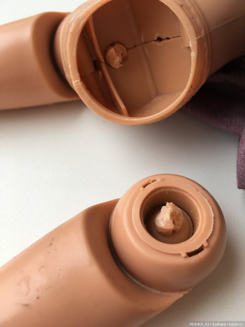 я думала над вариантом, как ей помочь. Поиски донорских ног успехом не увенчались. Кукла большая, до 80 см ростом.Ремонт родной ноги внушал страх и расстерянность.Диск отломан, присутствуют не все фрагменты.По приезду домой оказалось, что проблема намного глубже.от места, где отломан диск, внутри ноги, идут трещины.не хватает много кусочков, к тому же, где место отлома, материал крошится как печенье (.