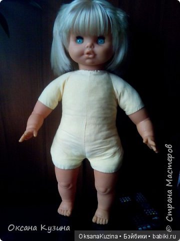 У меня такая же лежит только без хвостиков, наверное мальчик, т. к. в родном голубом комбинезончике и просится на переделку. Голова повисла носом вниз, надо перенабивать. Можно уточнить, чем Вы ее перенаполнили.