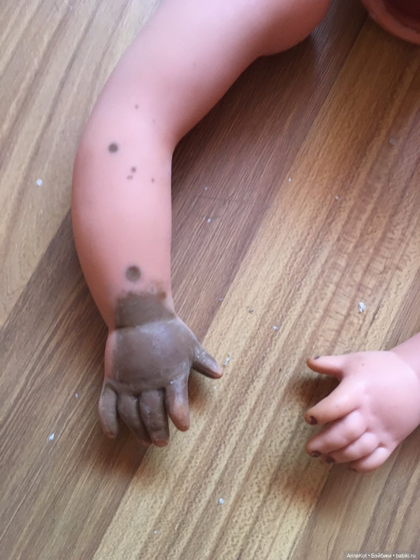 Старый кукольный раскрас в виде непонятных розовых пятен выводила долго, ещё дольше очищала винил просто от въевшейся грязи.