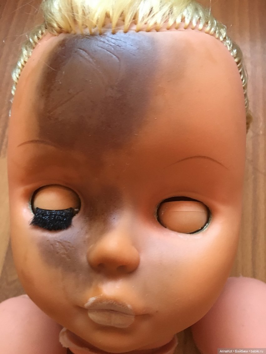 Итак, куколка была облита чем-то непонятным, верхний розовый слой винила «залип» на лице и руках. Присутствовала чернота немок, вылезали и крошились волосы, от роговицы глаз отошла краска. Фото «до» нет, так как я забрала только руки и голову. Но приблизительно можно понять весь масштаб ужаса на этом фото: