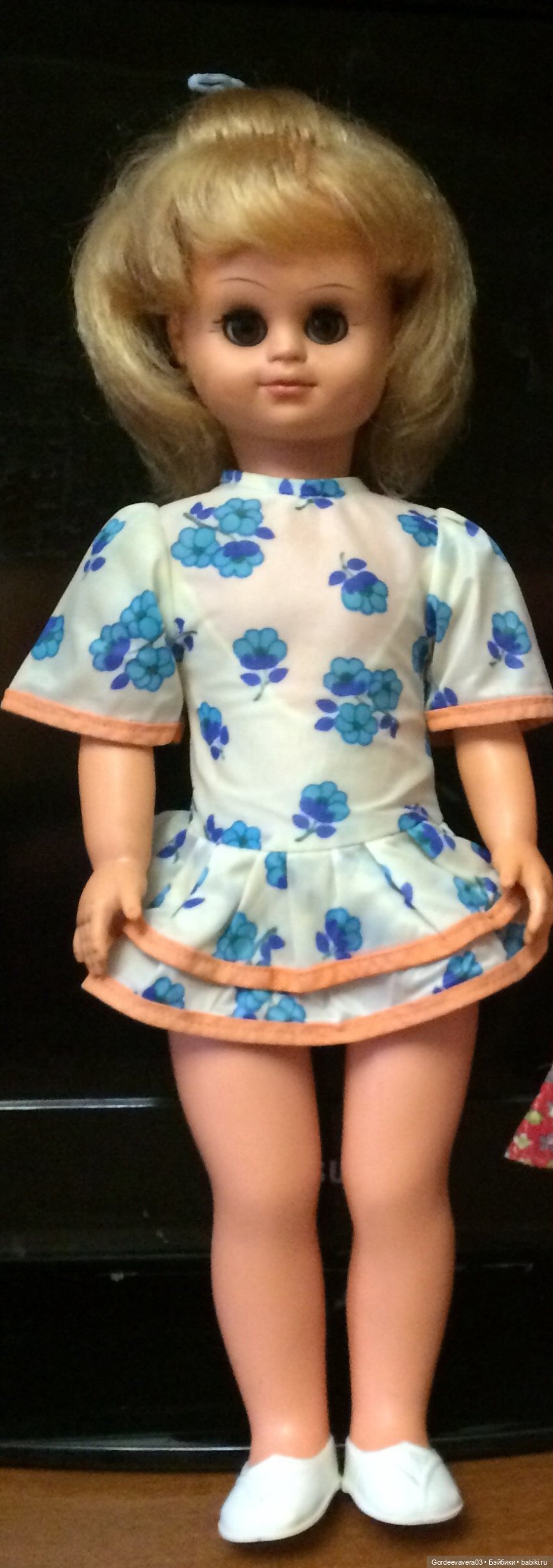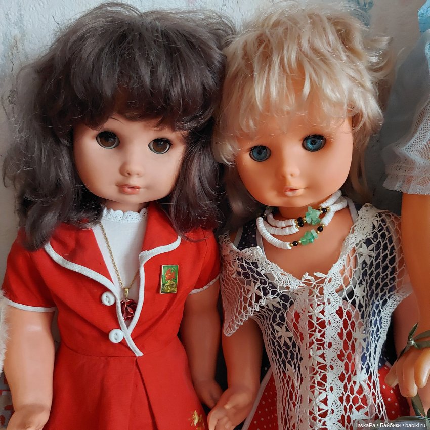 Мне кажется, что хоть блондинка и помоложе, но все равно куклы относительно старые — у них пластиковые руки на резинках. Потом руки стали делать из того же материала, что и голова с дисками вместо резинок. И геометрия рук уже не та…