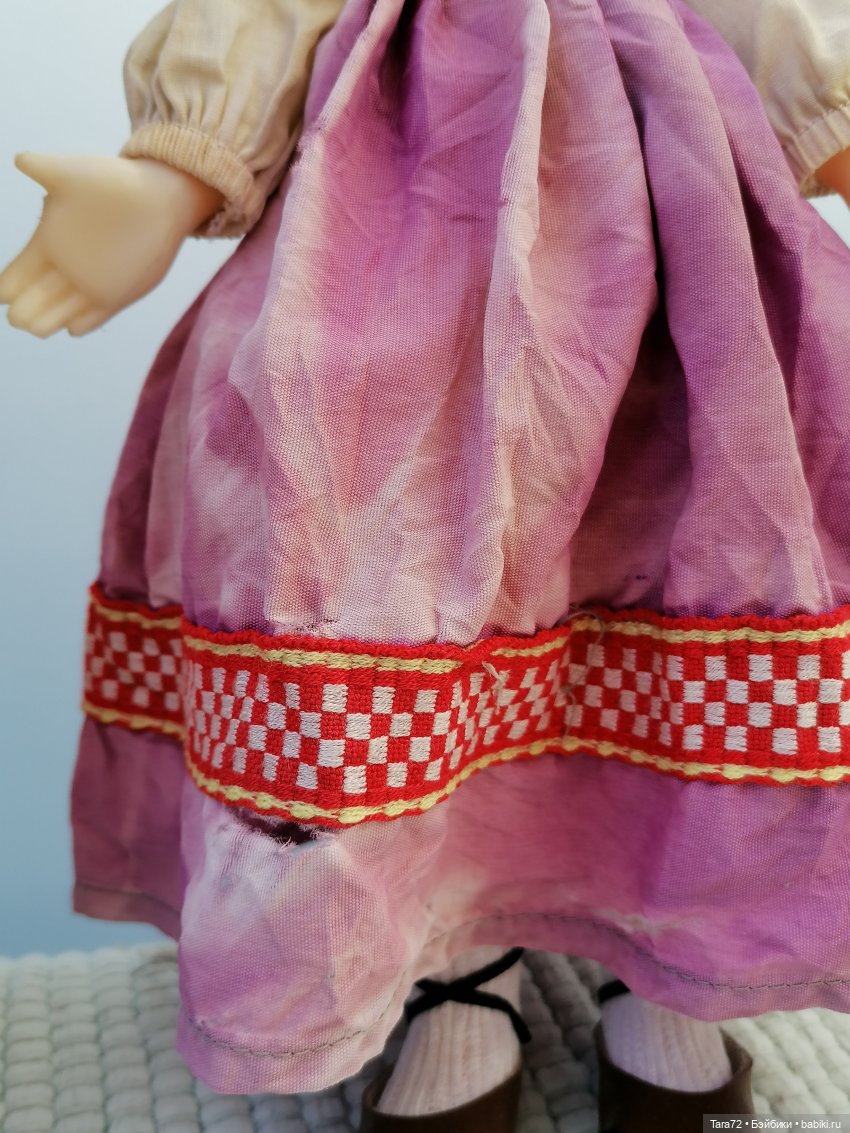 У неё платье интересное, с бантиками и отделкой оранжевой. Хотела куклу отмыть, одежду постирать.