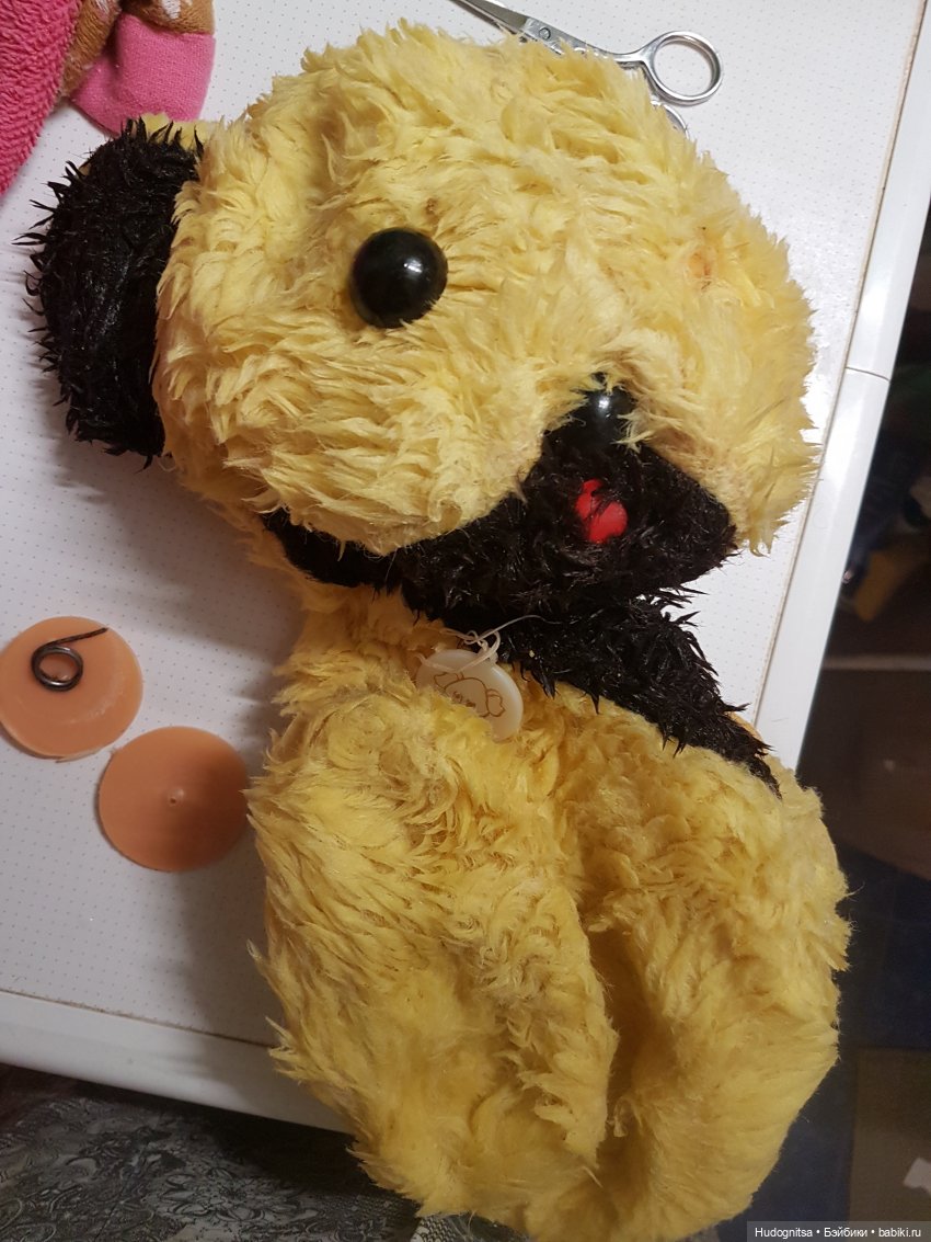 Попался моему сыну в руки толи пёс, толи мишка: жёлтенький, с язычком, медалью на шее, крепление лап на шплинтах. Всем хорош, только очень запыленный. Ему не меньше 35 лет. И за это время он ни разу не купался)))