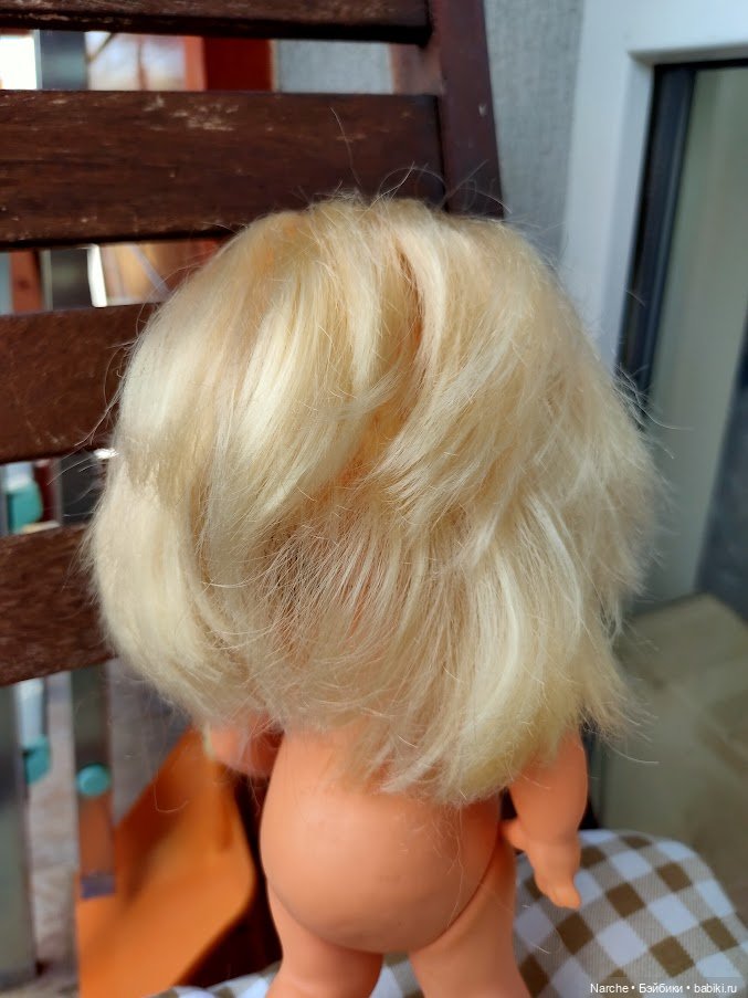 Купила куколку Göbel, грязную и убитую. Отмыла. После мытья обнаружилось, что над прической уже поработали. При этом волосы густые, блестящие и очень крепкие.