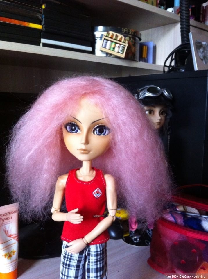 А вот второй парик, уже из мохеровых трессов, купленных на Кулкет. Тоже не то, что хотелось. Потом уже поняла, что трессы нужны из искусственного мохера или канекалона. Про козу тогда не знала, у японцев мохер, модакрил, нейлон, козы в продаже не было))