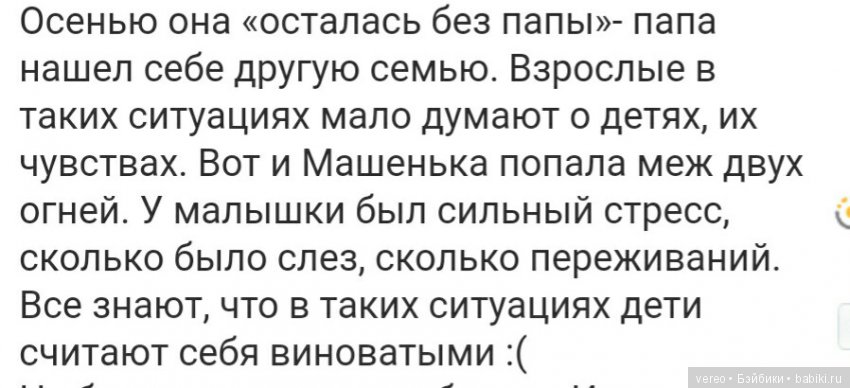 Осенью она «осталась без папы»- папа нашел себе другую семью. Взрослые в таких ситуациях мало думают о детях, их чувствах. Вот и Машенька попала меж двух огней. У малышки был сильный стресс, сколько было слез, сколько переживаний. Все знают, что в таких ситуациях дети чувствуют себя виноватыми :(
