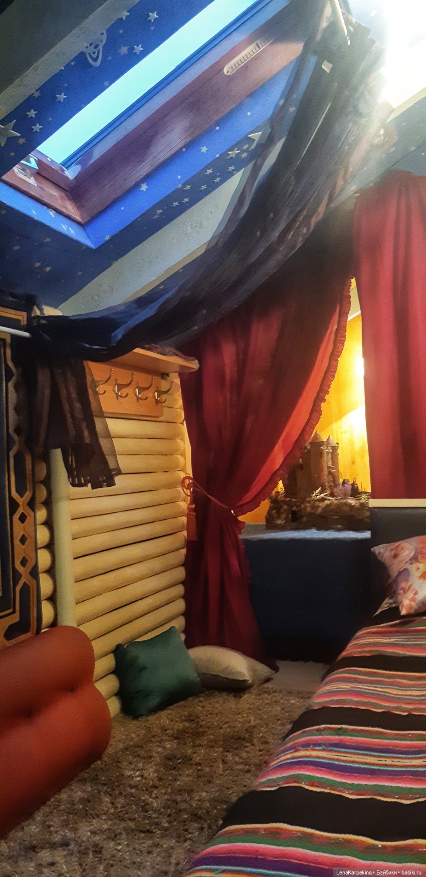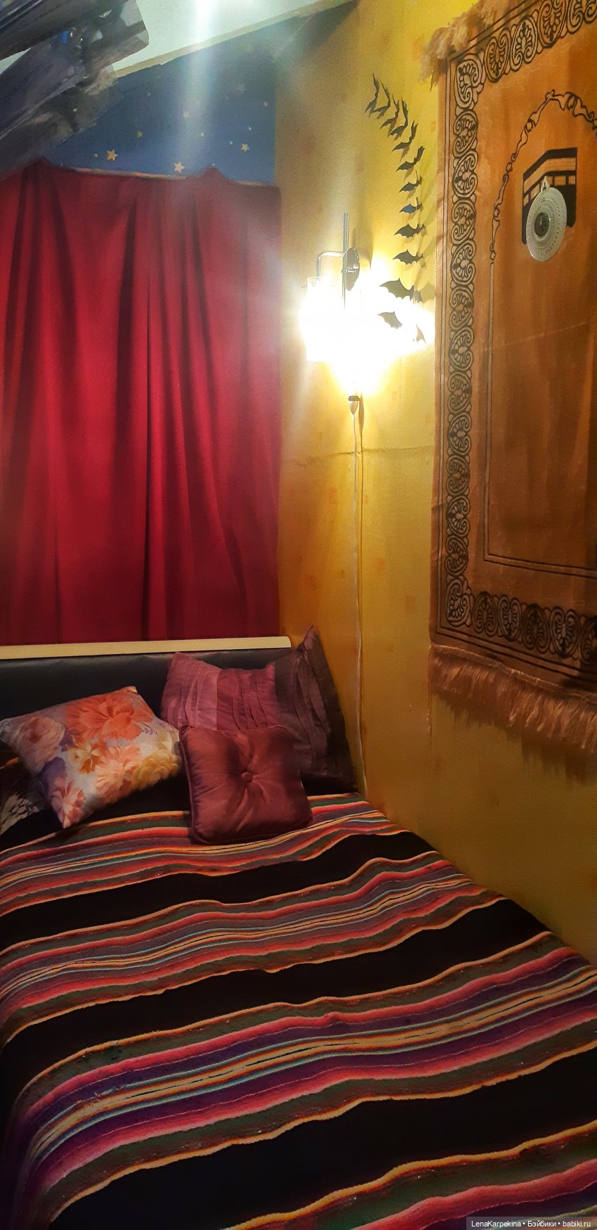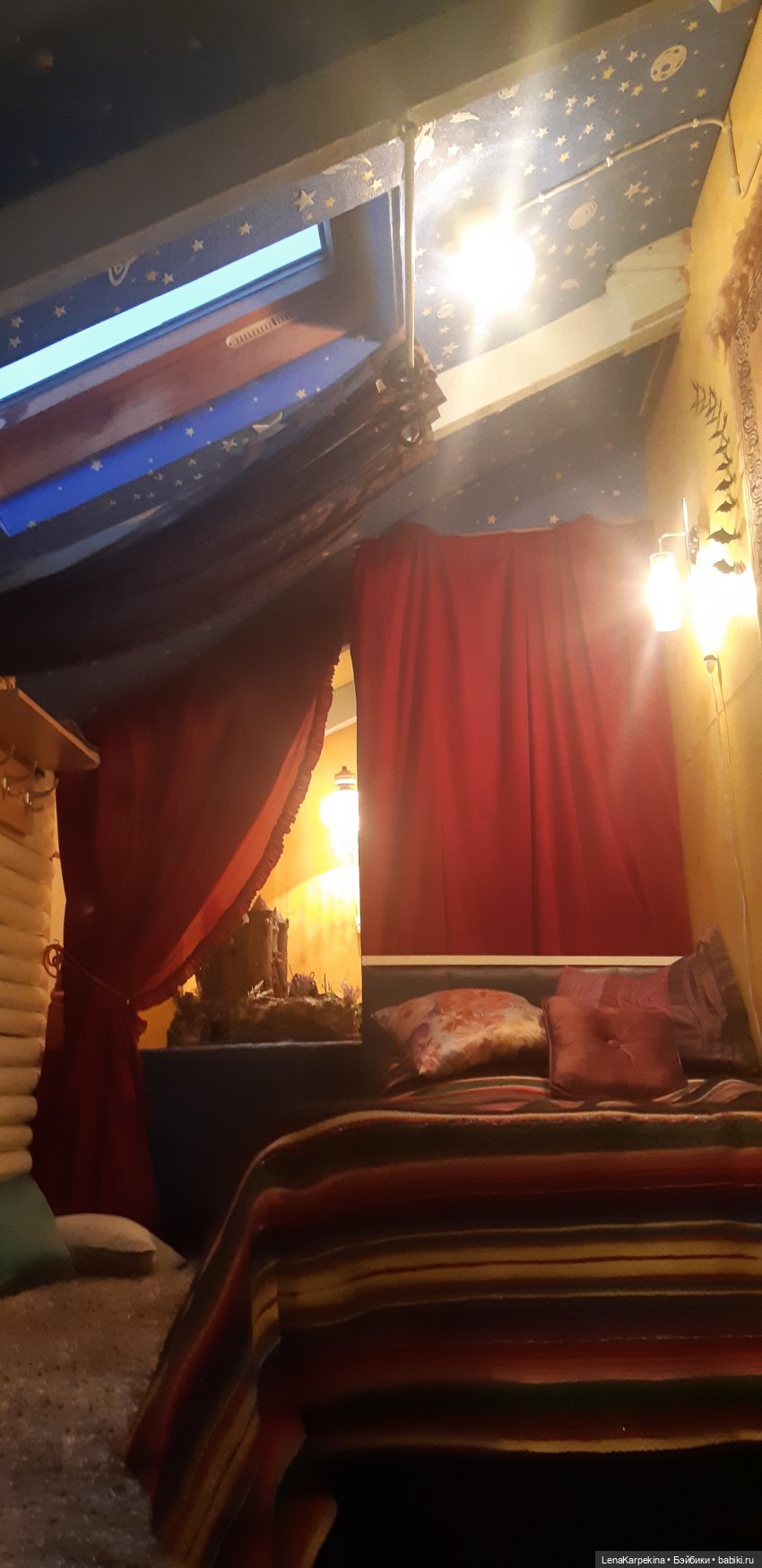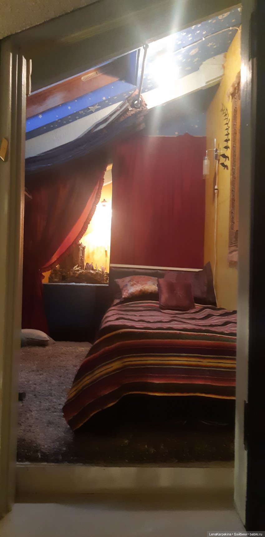Старая лампа. Пока не высохли витражные краски, тоже подверглась насилию с моей стороны. Сложно и долго расписывалась, потому что круглая и краски стекают. Но была доведена до определенного результата и повешена в самой дальней комнате дома. Правда светит до безобразия ярко и видна даже оттуда