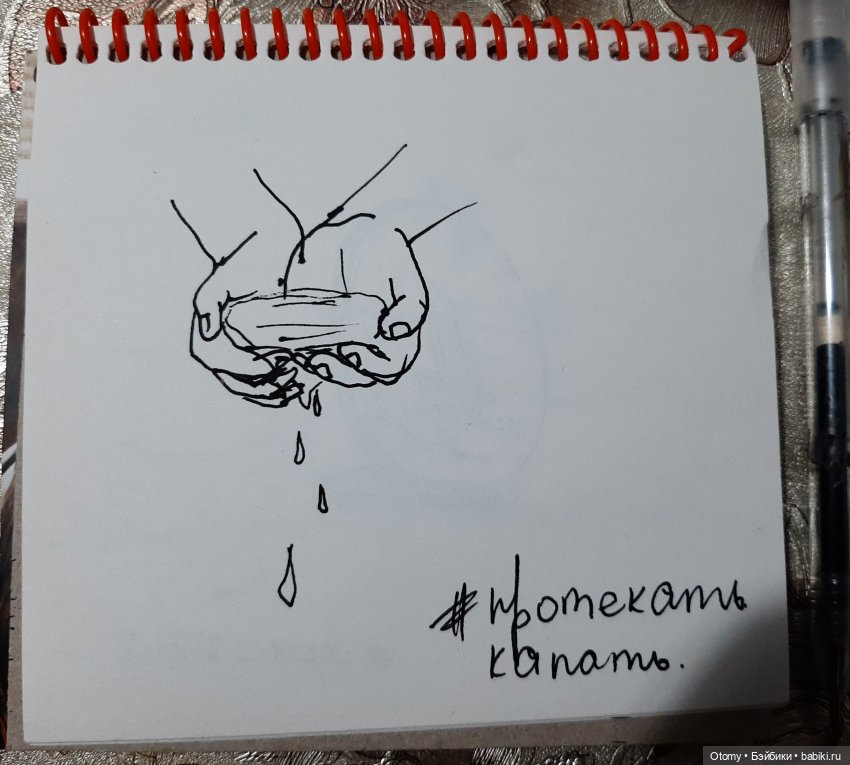 Рисунок «протекать/капать» с философским смыслом. Вода в ладонях — это жизнь, как не смыкай пальцы, вола просочиться сквозь них и по капле уйдёт. Так и жизнь, день за днем уходит