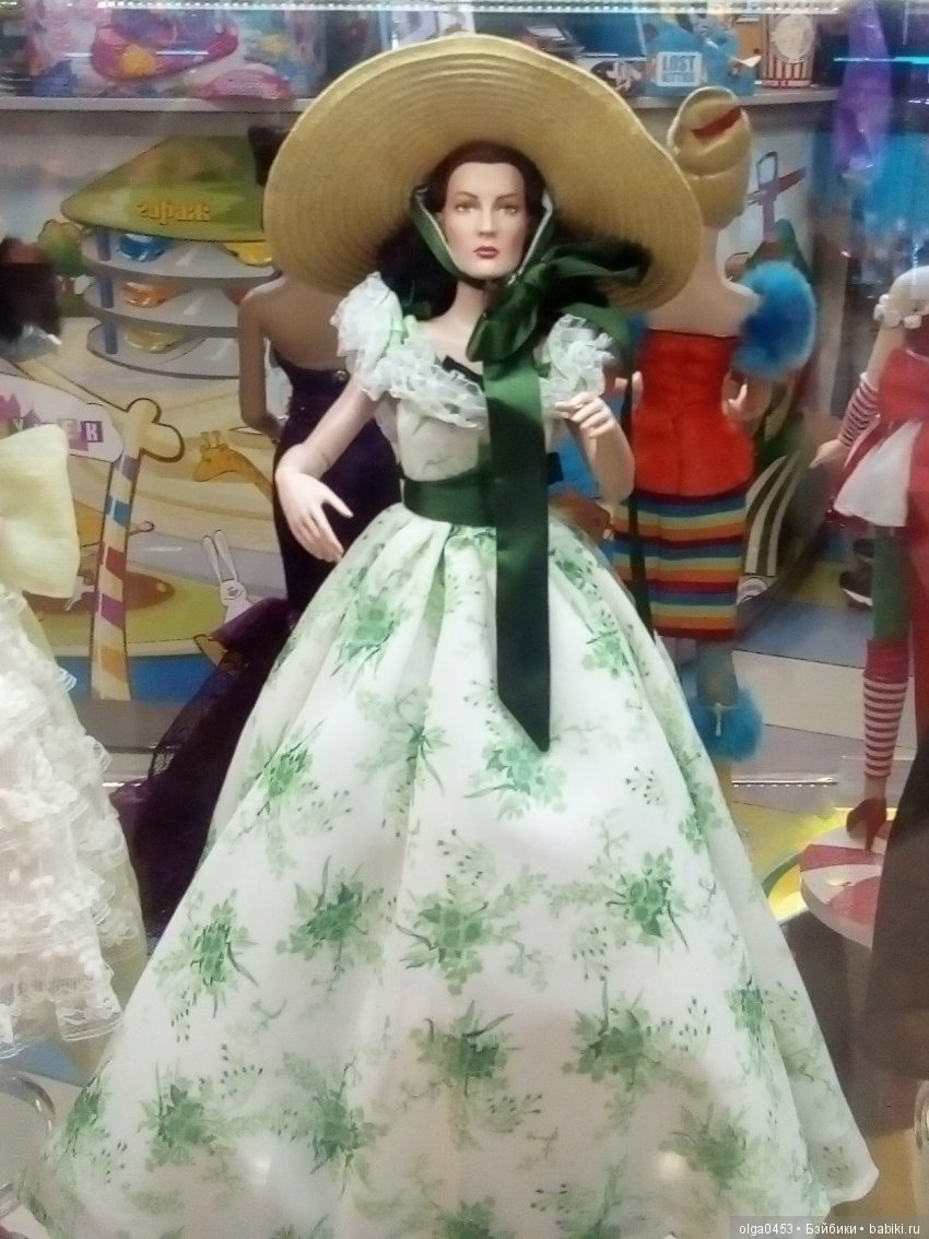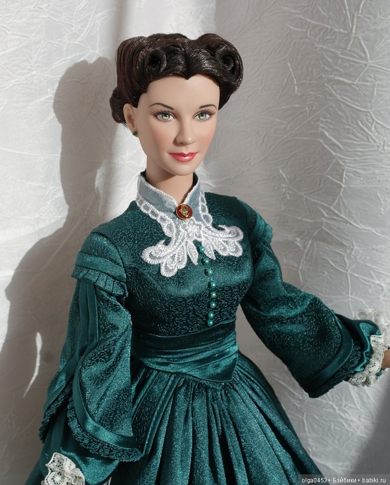 Кукла весьма эффектна, лицо прописано замечательно. Но, конечно, никакого драматизма отражающего ту ситуацию, в которой оказалась Скарлетт, на лице у куколки заметить нельзя. Аутфит дядя Тоннер сделал шикарный и мне даже кажется слегка переборщил со шлейфом. Всегда возникают проблемы с поставлением куклы в шкаф, в котором просто нет места, чтобы разложить эту шикарную красоту.