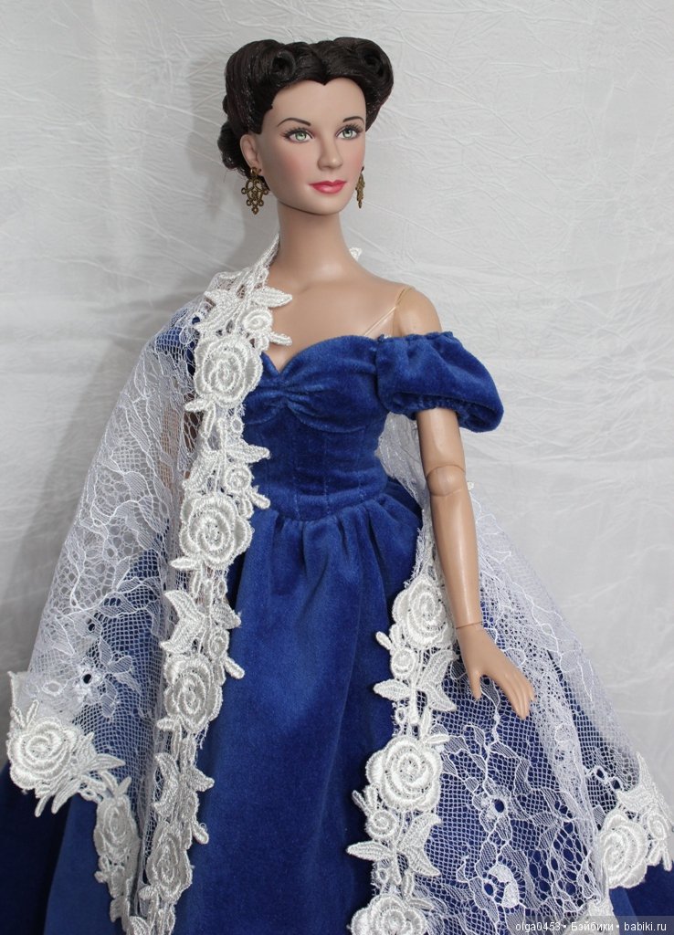 А аутфит синий с белой шалью. У меня сейчас в нем стоит рождественская Скарлетт, но у меня такое ощущение, что он ей не очень подходит.
