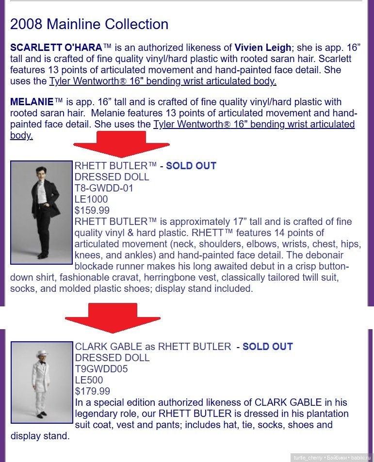 Чем больше я смотрела на моего Батлера, тем больше понимала, что он как-то вовсе не похож на Кларка Гейбла, а скорее напоминает Тимоти Далтона, актера, который снялся в не слишком удачном продолжении «Унесенных ветром». А вот Батлер 2 больше похож на К. Гейбла. Нормального каталога кукол на сайте Роберта Тоннера больше нет, возможно, где-то более подробную информацию Тоннер выкладывал по поводу Батлеров, но я её не нашла. По моему мнению, Ретт 2008 г. сделан по мотивам внешности Т. Далтона, а Батлер 2 на базе К. Гейбла, но и у того и другого, с моей точки зрения, похожесть на актеров минимальна.