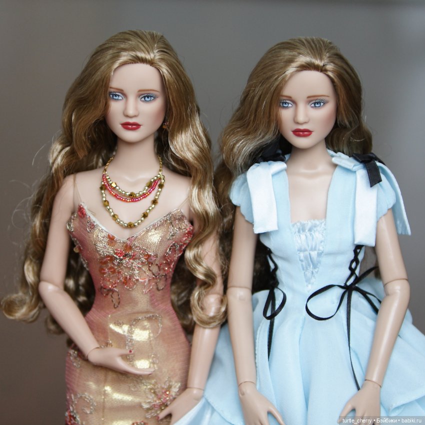 У меня, например, есть вторая Стелла Гилт Гламур, посаженная на тело Антуанетты. Слева фабричная, в родном наряде, справа — гибрид, голова для тела Тайлер посажена на тело антуанетты, так можно, голова садится легко. Наоборот (голову для антуанеттинского тела на тело Тайлер) — уже не выйдет.