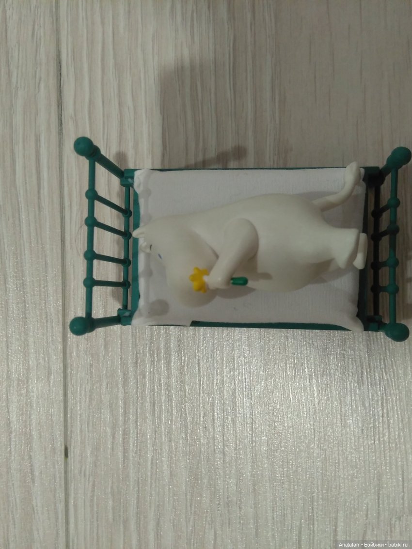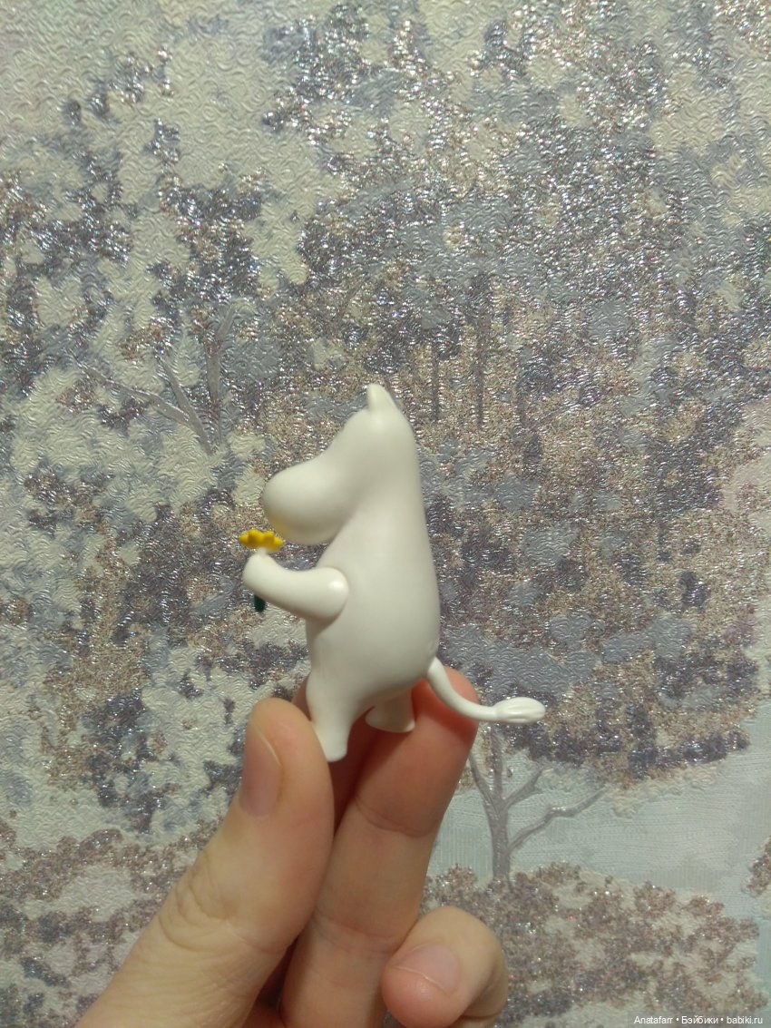 Рост Муми-тролля — 6 см. Сзади длинный хвостик, благодаря которому фигурка может стоять.