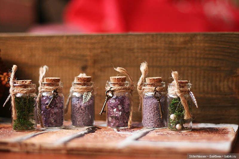 Что делать с остатками, я придумала сразу. Так как для кукольного «варенья» я собираю различные пузырьки, было решено сделать«бутылки с песком» на скорую руку в кукольный интерьер.