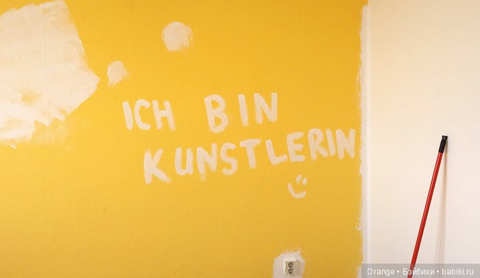 А потом (перед сдачей его обратно арендодателю) мои любимые стены надо было покрасить обратно в белый. Ну я и начала с надписи… Переводится как «Я Художница!» )))) Давно мечтала на стенах порисовать))