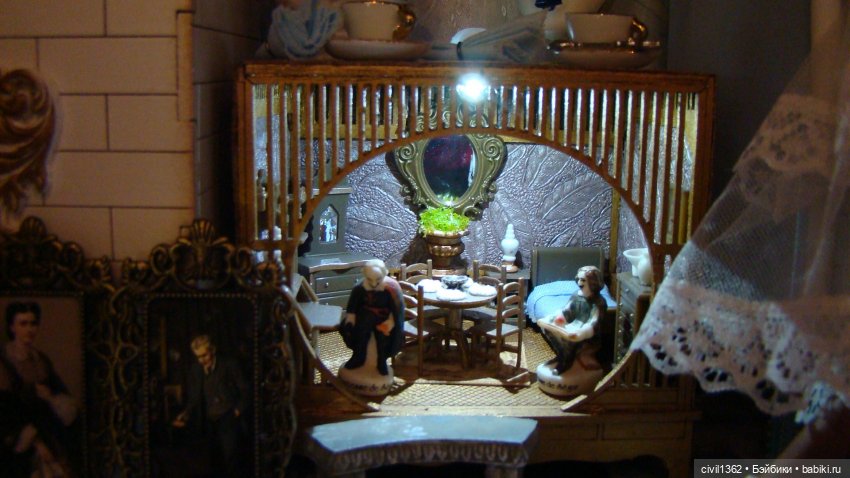 Начала собирать его 5 января 2020 года. Сотрудничала со многими мастерами-миниатюристами из разных городов России. В предыдущих топиках перечислила почти всех по именам. Всё делала неспешно. Клеила обои, пол, подбирала мебель и мелочи для обустройства. Создала пано на стену из имеющейся в наличии латунной миниатюры. Так как я делала украшения для женщин, у меня накопилось всякой разной фурнитуры достаточно много. Вот нашла ей применение.