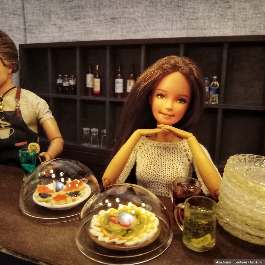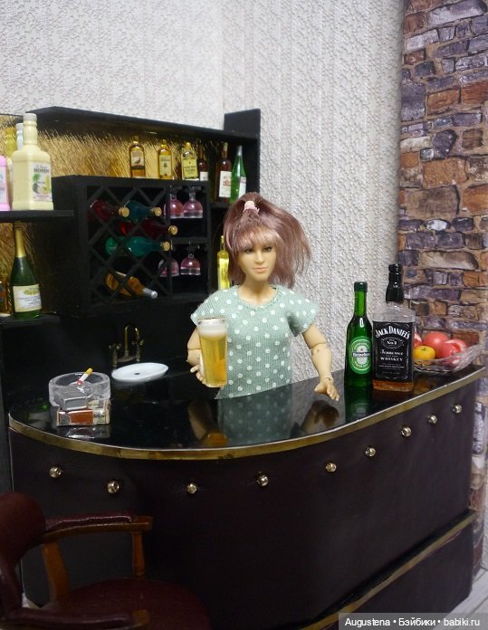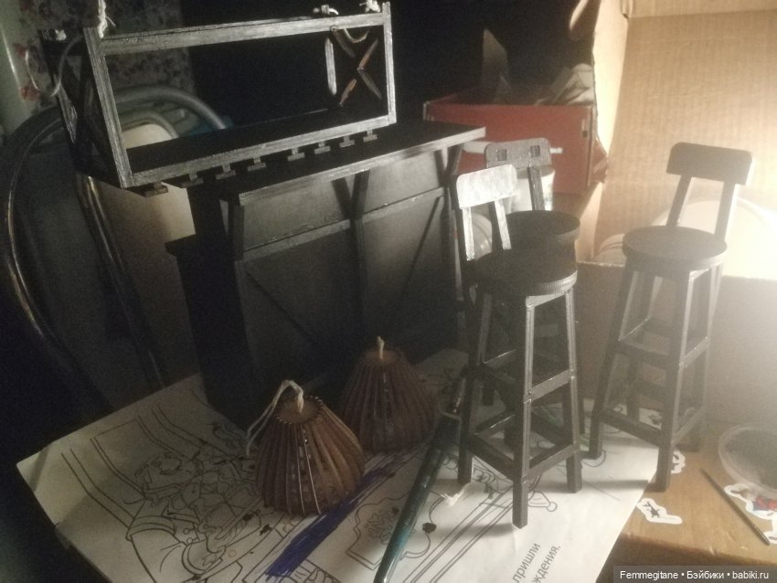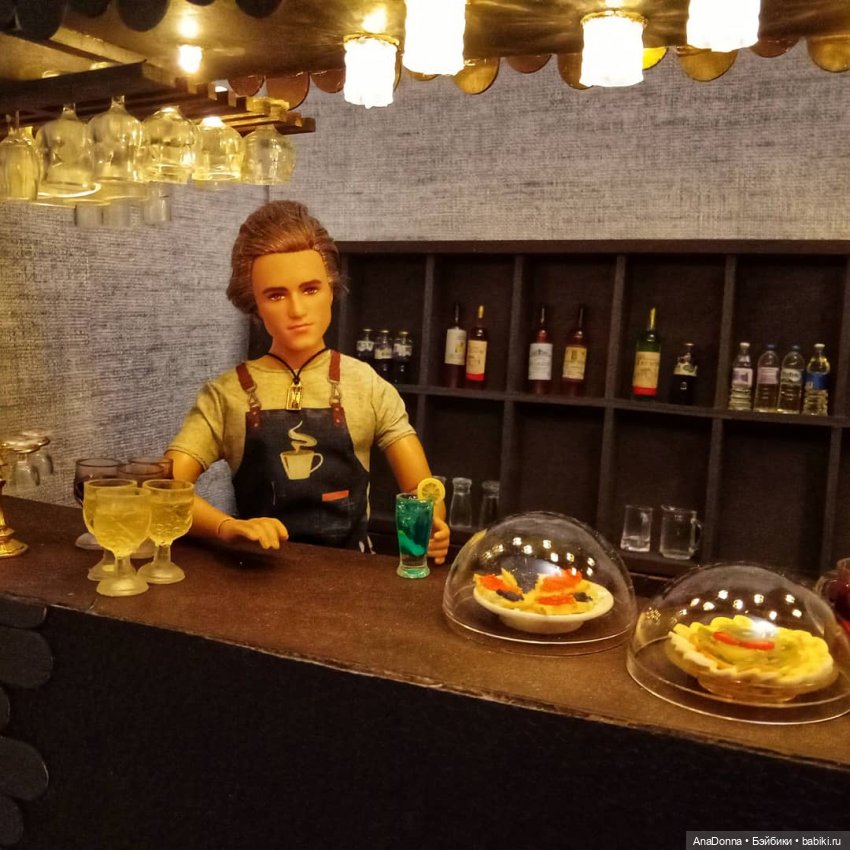 Театр начинается с вешалки, а ресторан — с барной стойки. План проекта сложился быстро и я начала клепать. Сама стойка склеена из гофрокартона и трубок от фольги. Обивка — искусственная кожа, частичная оклейка деревянными шпателями. В крышу стойки вмонтирована гирлянда на 10 диодов. Плафоны склеены из обрезков от прозрачных икеевских ковриков для кухонных ящиков. Подвеска для бокалов — остатки фанеры после вырезки деталей кресла (заказывала деревянную кукольную мебель для сборки). Винный шкаф сделан из деревянной коробки от ножей Gipfel и переплетного картона. Все покрашено коричневым акрилом в несколько слоев.