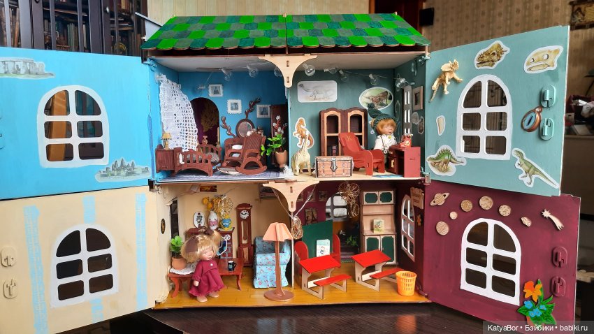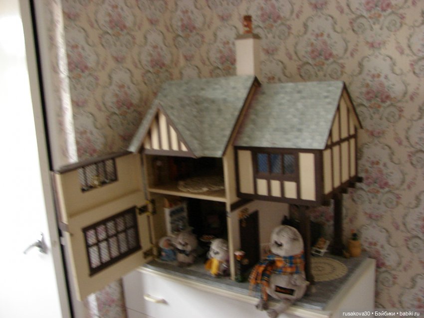Светлана, я про свой когда-то публикации делала, сейчас уж подзабросила его, но еще покажу. Точнее, у меня 1 + 2/3 Дома. Дверцы «штатные» я сняла, что можно было заглядывать в дом, не открывая их. То есть заменила просто на оргстекло.