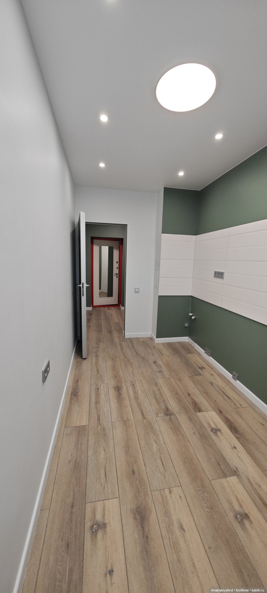 Кухня и коридор такие же, а совмещённый санузел чёрно-белый.