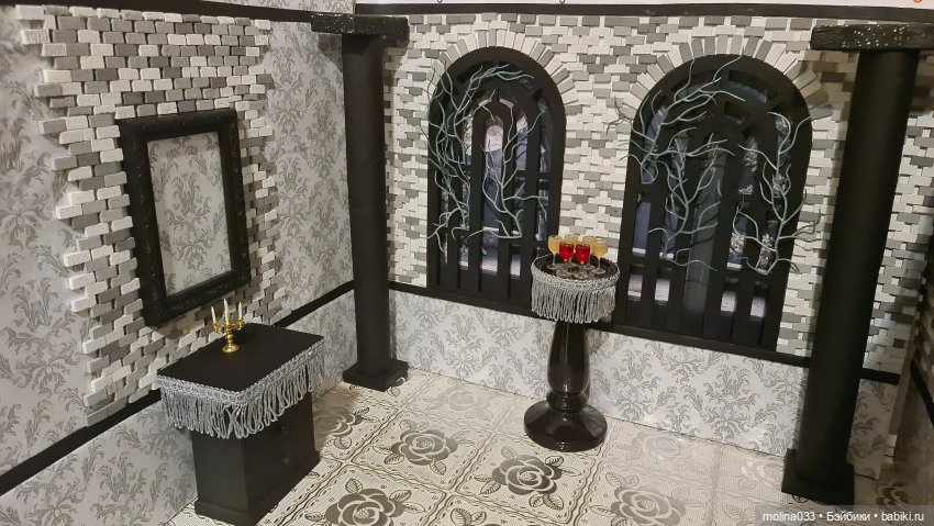 Серый зал активно уже использовался в сериале. Черные окна мне особенно зашли с серыми ветками в них. Такая мрачная готичность! И для удобства во время съёмок я доделала третью стену