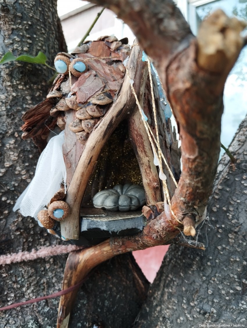 Главный секрет этого домика в том, что он уличный. Он собран из пластика, фетра, дерева, коры и проволоки на надежный клей. Он не размокнет под дождем, хотя на зиму лучше снять после получения красивых заснеженных фотографий))