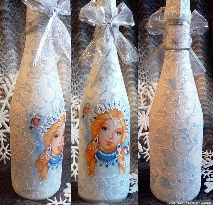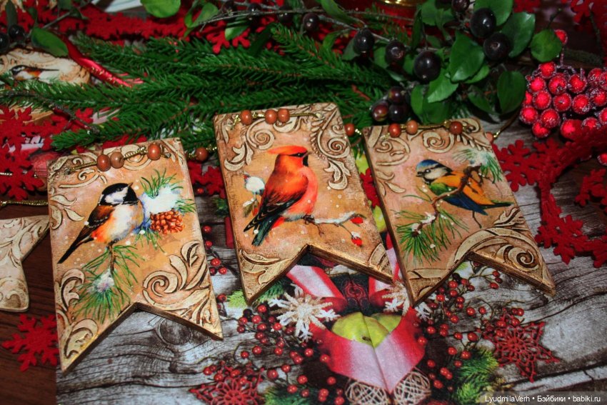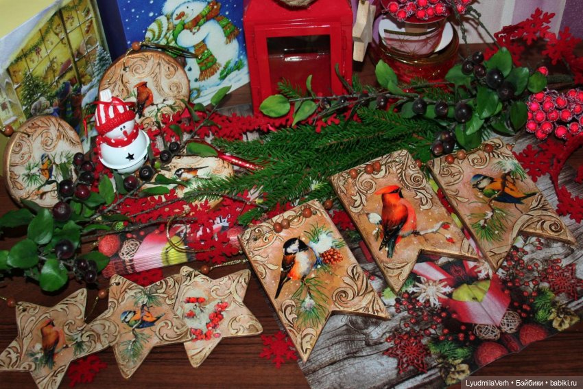 Но есть фото декора бутылки (декупаж, контуры) и деревянных заготовок, я их на уличную елку каждый год добавляю- декупаж, шпаклевка через трафарет.