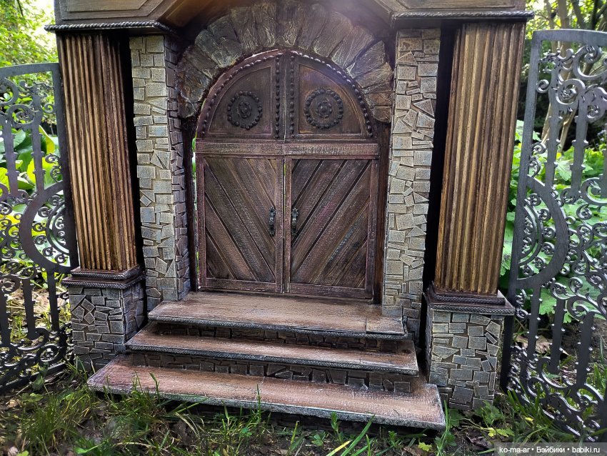 Проём я не мерила. Надо поинтересоваться. По высоте он чуть выше куклы. На голову или около того. Внизу 3 ступеньки. Они съели много высоты. Когда кукел стоит у ступенек, то еще нормально смотрится. А в проёме уже непропорционально.