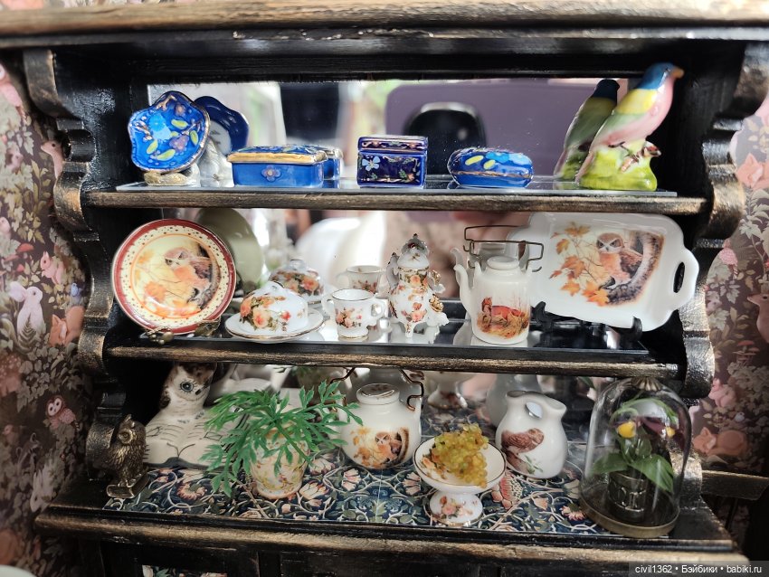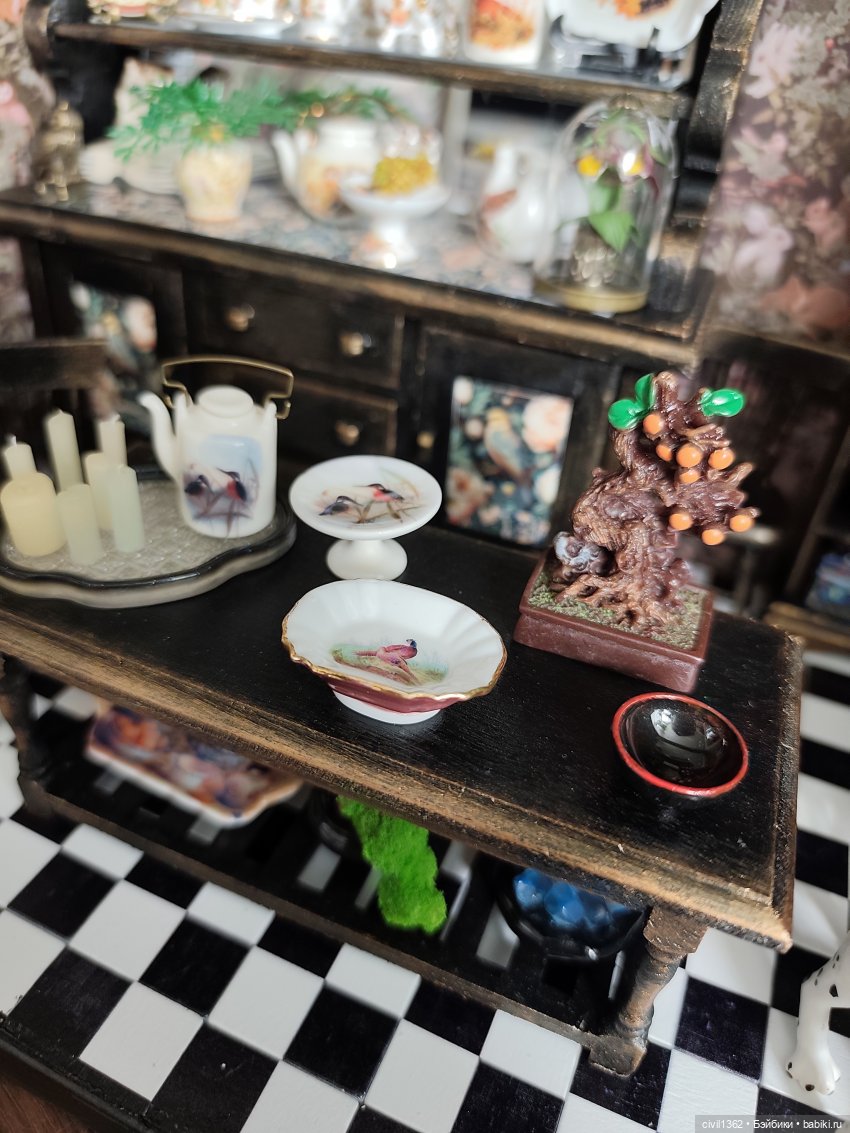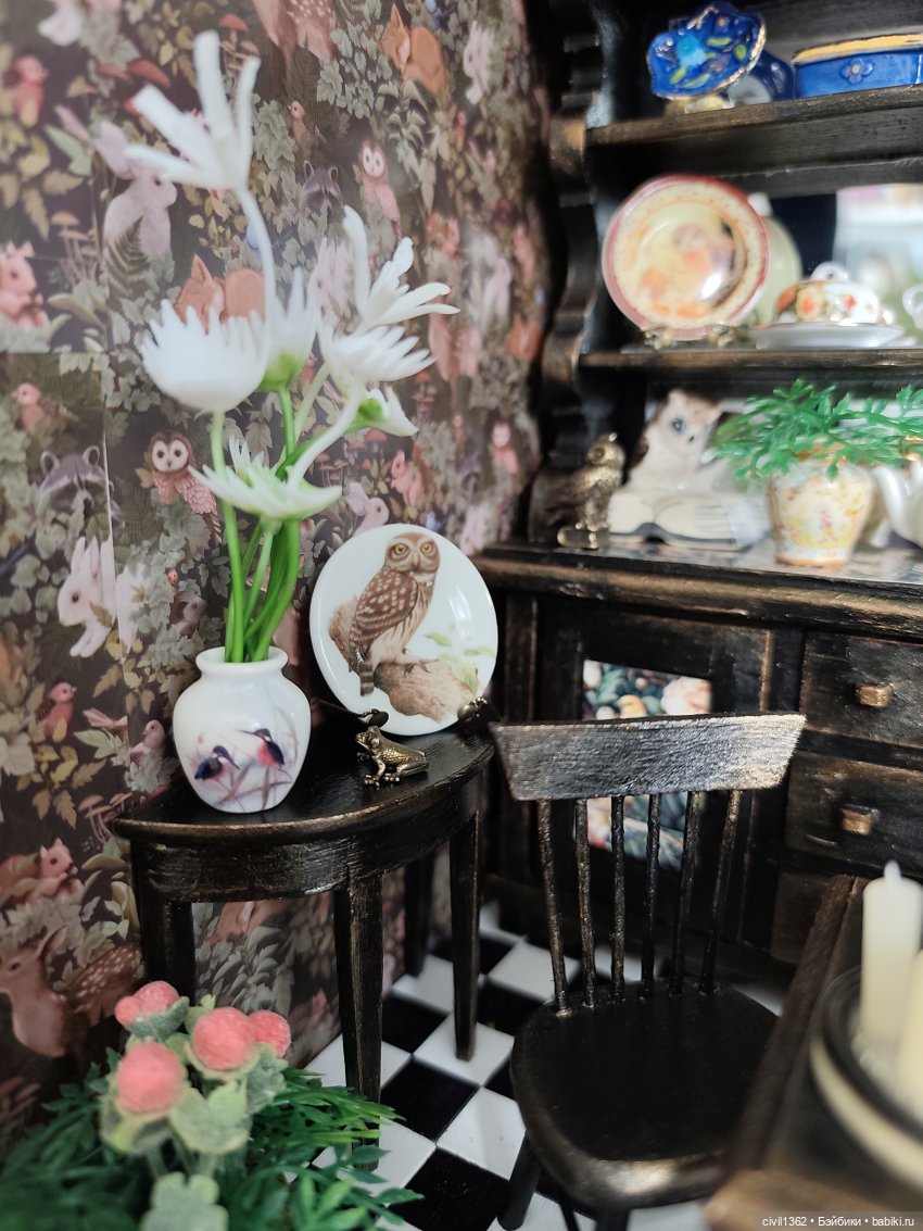 Женщина отправилась бродить по любимым группам миниатюристов: Людмилы Адеяновой из г. Самары, Натальи Соколовой из Москвы, чтобы найти всё необходимое для своего нового мира. На Озоне она купила красивые обои и плитку для пола. Мебель она купила из неокрашенного дерева и покрыла её акриловыми красками и патиной, чтобы придать ей старинный вид.