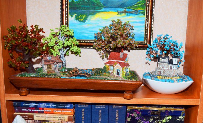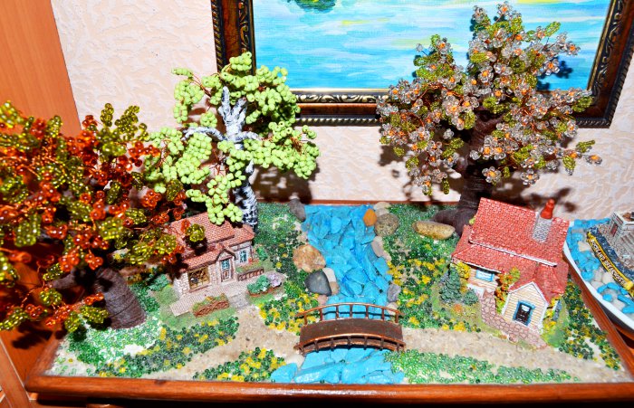 Сама очень давно с подрастающим сыном делали работы с домиками, только использовали бисерные деревья (он тогда очень этим был увлечен), ставили только в гибсовую основу все объекты, увлекательный процесс, я вас так понимаю!