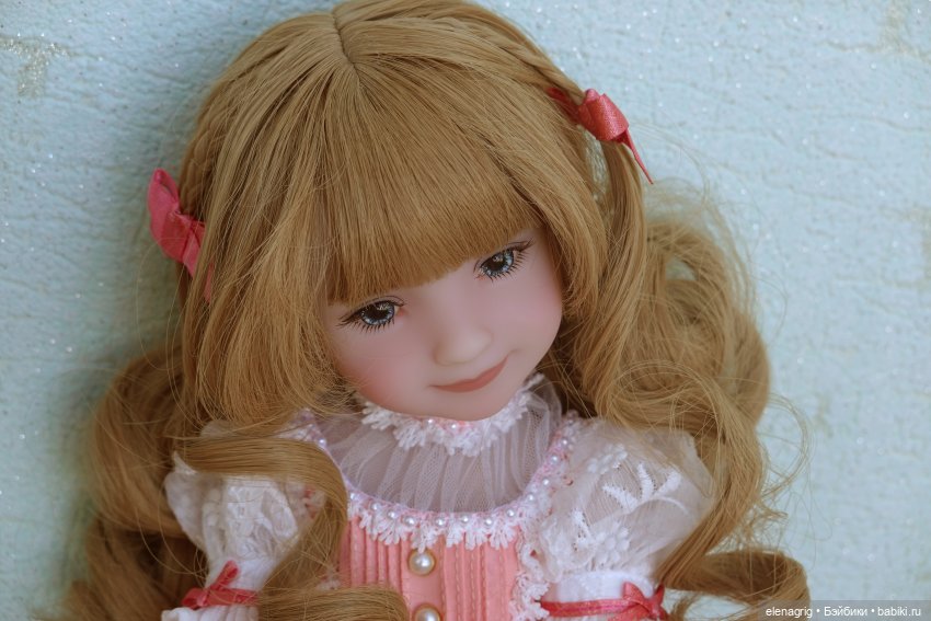 А вот волосы… Спасибо Оле (ole_ole ), что успела меня предупредить — волосы действительно лучше лишний раз не трогать и не расчёсывать. Они жестковаты, а если лезть к ним с расчёской — приобретают довольно неопрятный вид. Я на пробу распушила один локон Дарлы, потом долго приводила его обратно в порядок. Возможно, тоже решусь на смену парика в будущем. Вот цвет волос мне очень понравился, нежный и интересный, без преувеличения скажу, такого красивого оттенка я не припомню у кого-либо из своих кукол. Вот бы найти парик такого же оттенка. Может, кто знает места/мастеров и посоветует что-то?