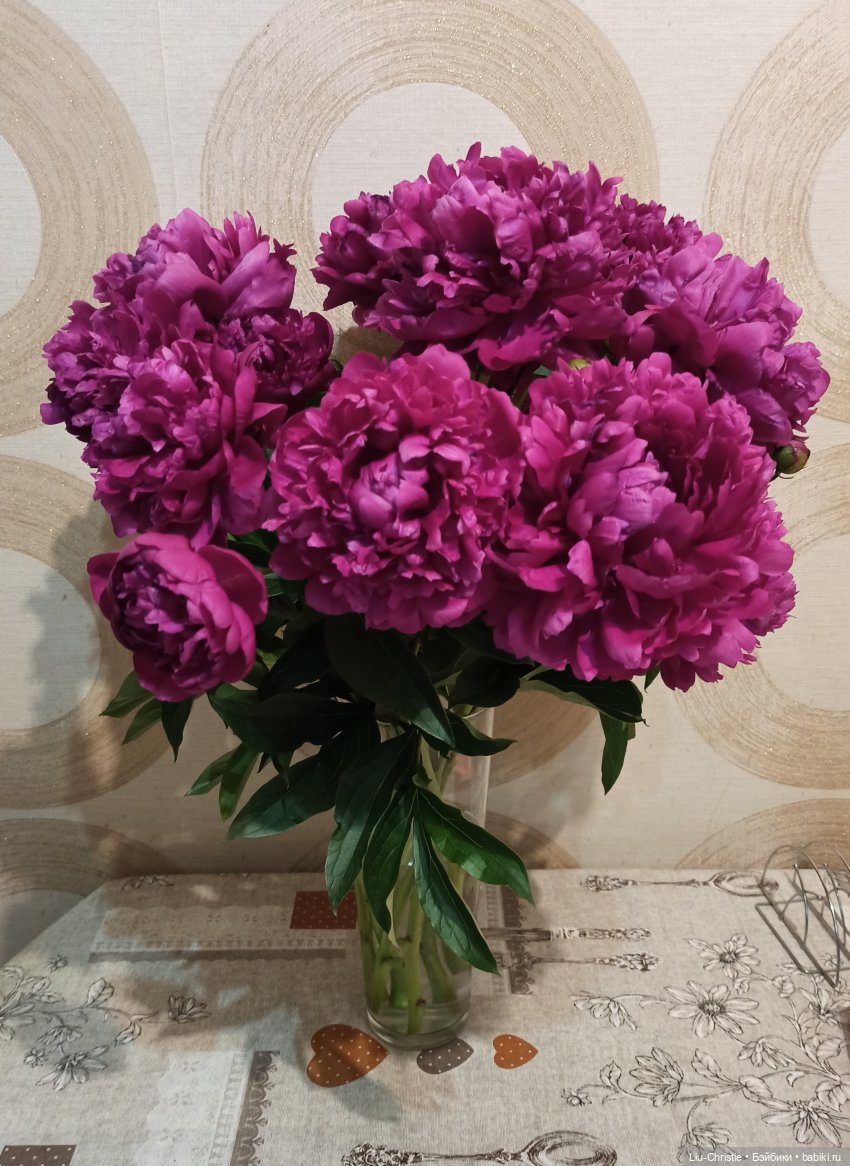 У нас уже который год во время цветения пионов идут сильные дожди и все цветки клонятся к земле. Но всё равно домой привезла букет. Аромат необыкновенный!