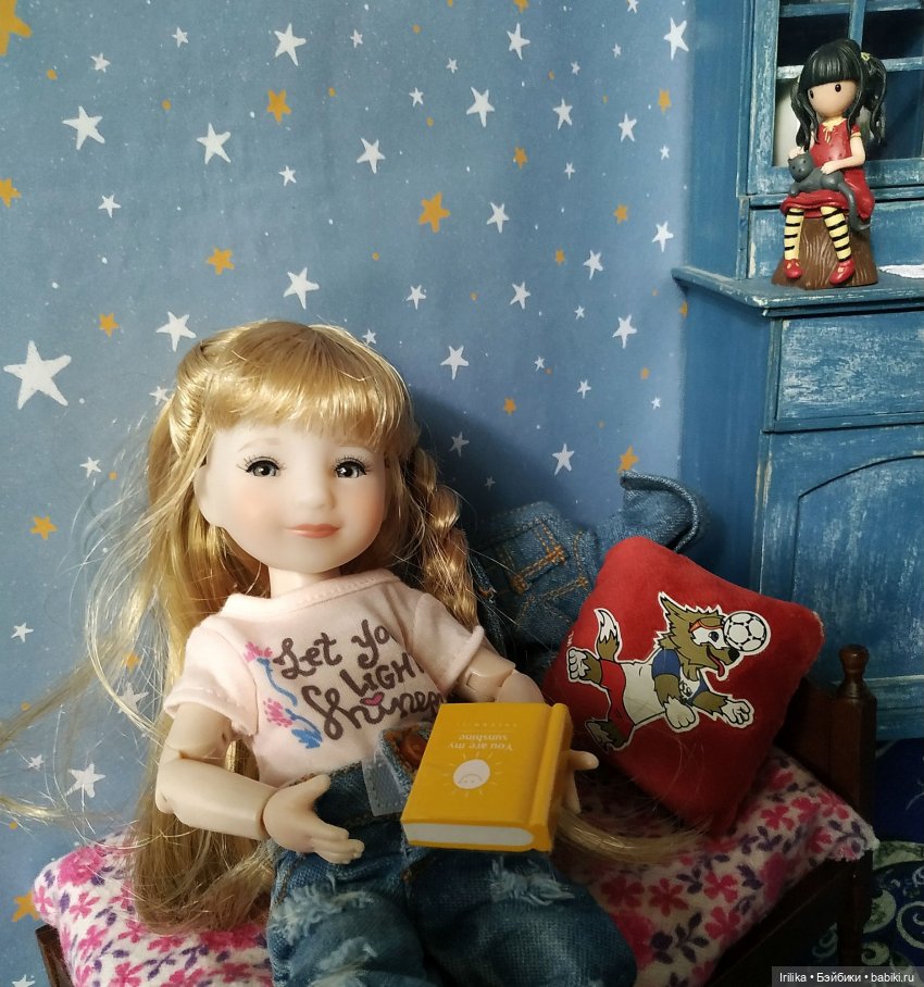 Теперь к самой кукле. Кукла ростом 8" (20 см) уменьшеная копия Сары 37 см. Одета в джинсовый комплект и футболку, на ногах цветные кеды.