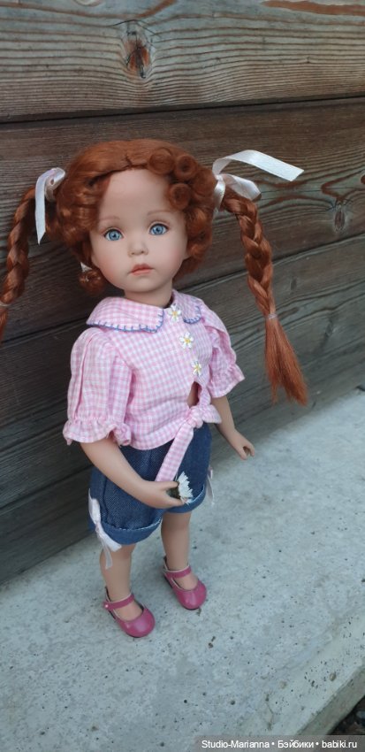 Лицo куклы естественное, детализированное; глаза – акриловое стекло; волосы: парик (съемный). Благодаря шарнирам кукла имеет 9 точек артикуляции: плечи; локти; колени; область крепления ног к телу; голова.