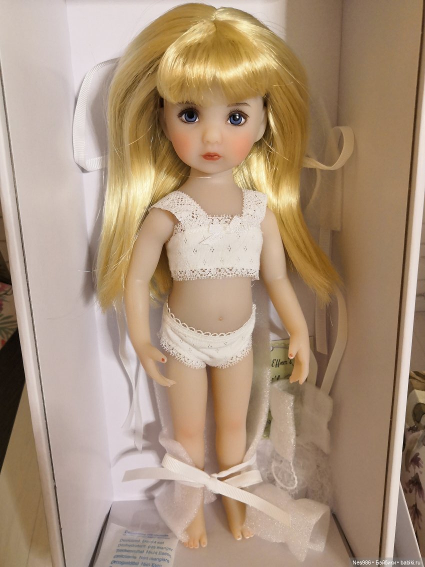 Тело у нее (и у подружек), как в результате разобрались, слизано не у Ханны Готц, а у Ян, тоже Готц, но 25 см высотой. Старые, красивые маленькие куколки (Ян, Гюнхильд, Штефка), редкие, не дешевые и часто уже проблемные.