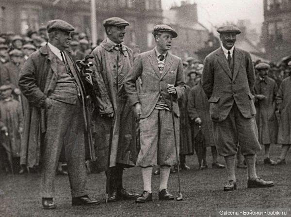 Герцог Виндзор увлекался гольфом и способствовал изменениям в мужском костюме, пренебрегая строгими требованиями к одежде в этом элитарном и модном виде спорта. Он носил пиджак вместе с широкими брюками длиной на четыре дюйма (десять сантиметров) ниже колена. Поэтому такой комплект назвали «костюмом плюс четыре» (plus fours suit). Костюм дополняет плоская кепка (flat cap), придающая образу демократичность и вместе с тем особый шик.