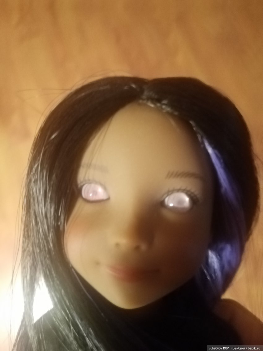 К Келли и Натали, в принципе, прилагались сменные глаза (они обе на Озоне куплены). Подумала, да и поставила им обеим родные. У Натали карие. Мне не очень нравится, как они у нее стоят. Повыше бы, а то взгляд с безуминкой :) Но не получается. Может, потом заменю на что-нибудь покрасивее. Натали тоже достойна глаз с блестками :)
