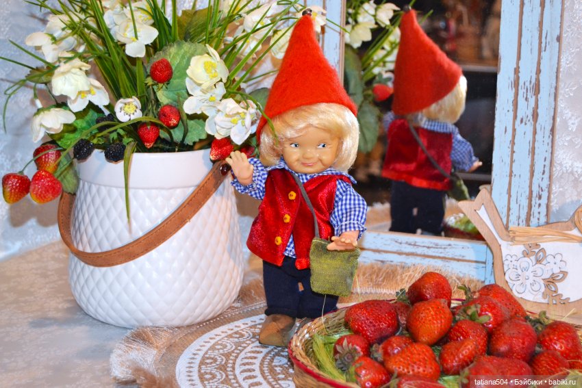 Наш гномик тоже принес вчера клубнику, перетаскали почти всю, оказалась очень душистая, НО я запретла брать последнюю и оставила тарелочку для фото (не могу без красивых фоток с куклами)