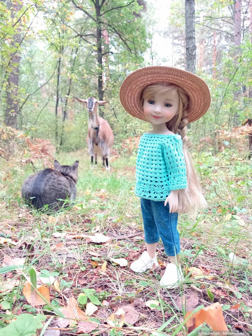 Козу Милку привели соседи, когда с её хозяйкой случился инсульт. Взяла, т.к. жаль козочку стало. Вот и гуляем… коза пасётся, кот сторожит, а куклы… живут своей жизнью