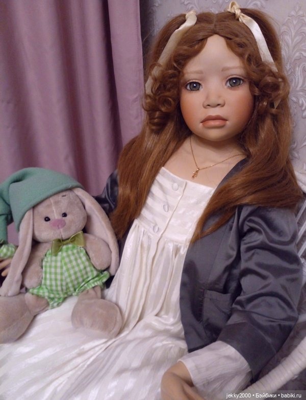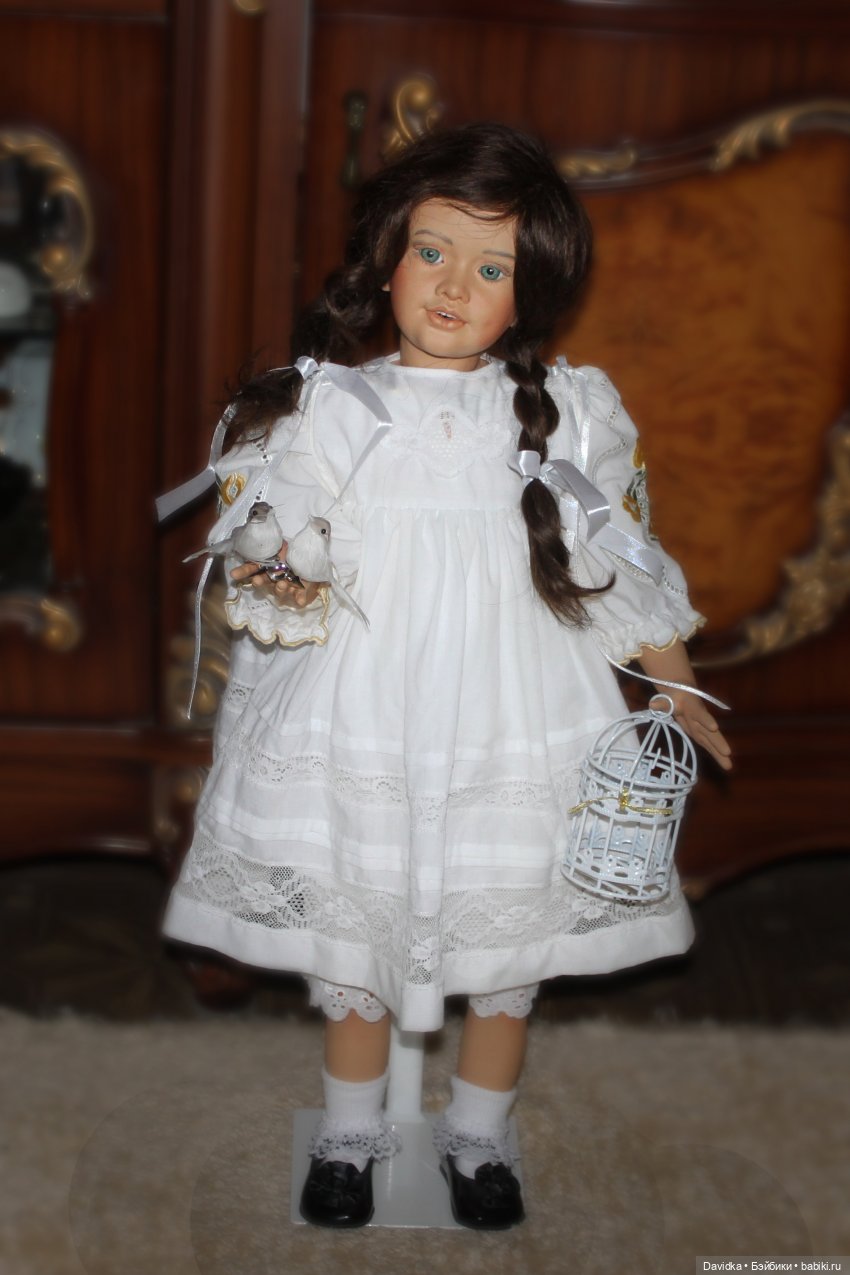 Итак… Девочка имеет ростик 50 см, прекрасную, нежную роспись личика, натуральные курчавые мохеровое волосики, глазки — стекло отличного качества, зубки, кокетливо поблескивающие за нижней губкой… )). На шейке подпись самой художницы по сырому фарфору( фото), там и лимит -20/20, а на мягком теле также есть подпись автора вручную).