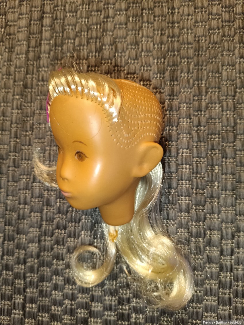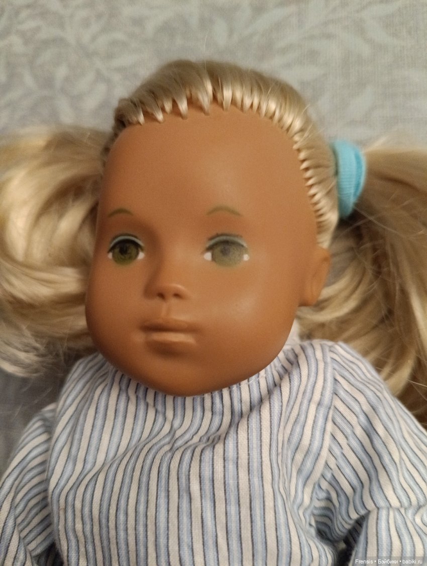 Живет она у меня третий год. Девочка в отличном коллекционном состоянии, только волосы выпадали, поэтому я их нарастила. Использовала локоны козочки натурального оттенка. Про стрижку пока не решила, вроде по возрасту она малышка и изначально у нее была короткая стрижка, но я люблю длинноволосых деток. У неё индивидуальная роспись глаз, которая значительно отличается от штамповки более поздних выпусков.