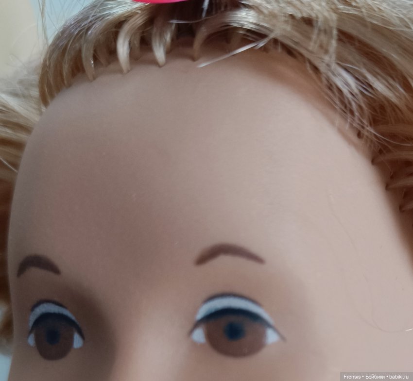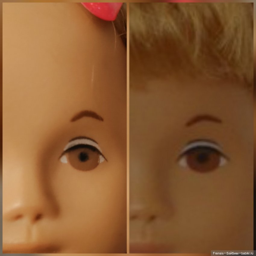 Внешний угол левого глаза, как бы, удлинен, а сам глазик уходит вниз. Глаза не перерисованные. Штампованные. Как так, что глаз другой? Кроме того интересно, что кукла перетянута, как до 1974 года, т.е. с крючком в голове. Малышка бесполая, т.е. она после 1978 сделана.