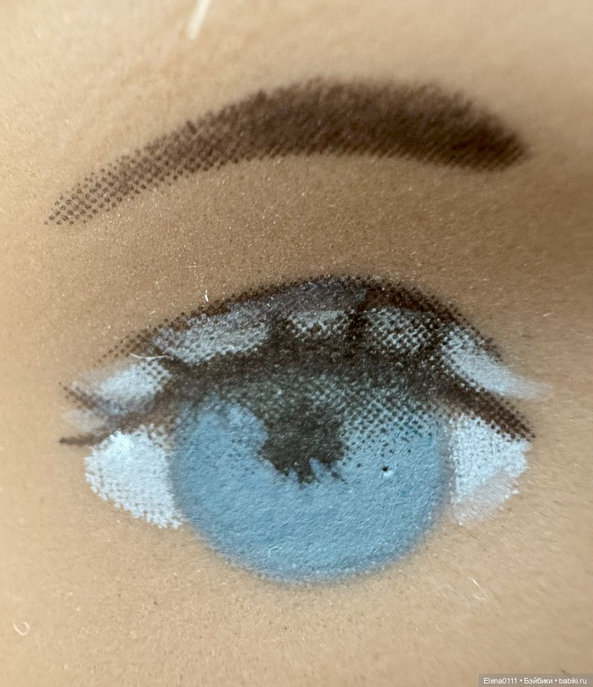 У моей глаза такие: голубая краска радужки лучиками заходит на зрачок, получается звёздочка наоборот какая-то, сама радужка очерчена так бледно, что тёмную краску линии почти не видно и верх радужки под верхним веком затемнён.