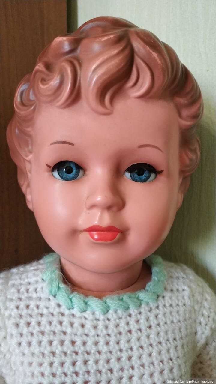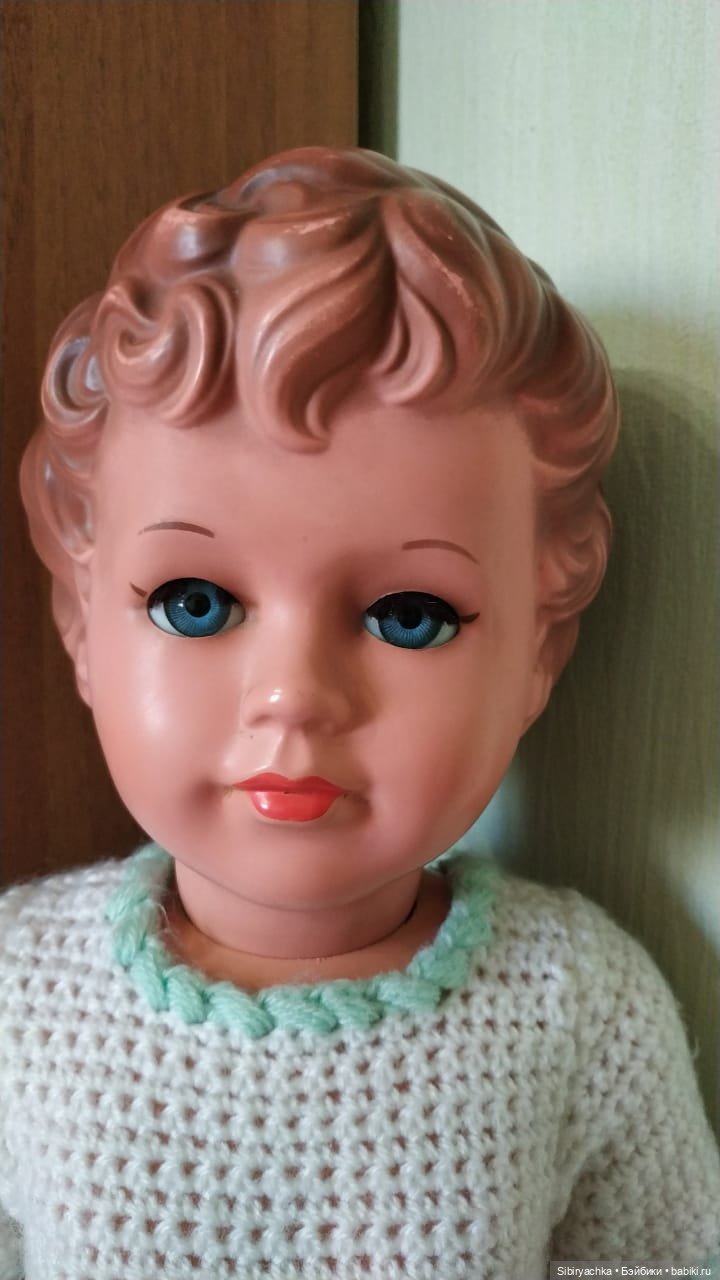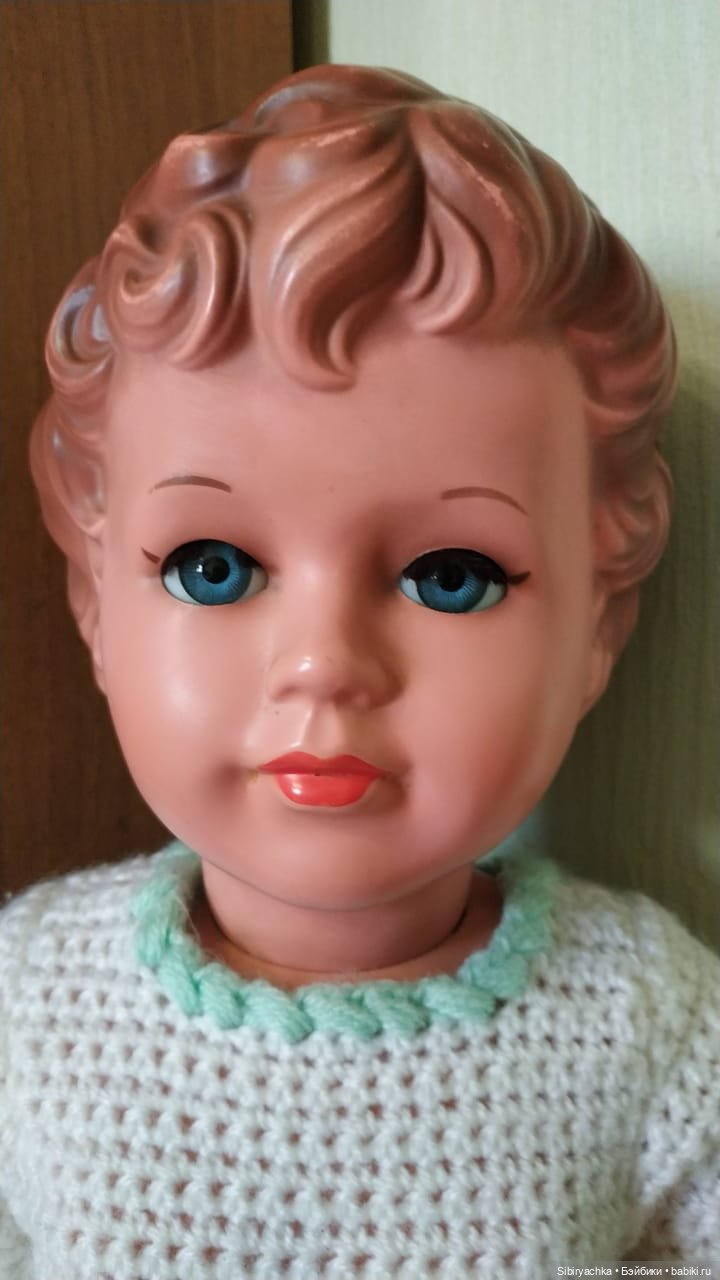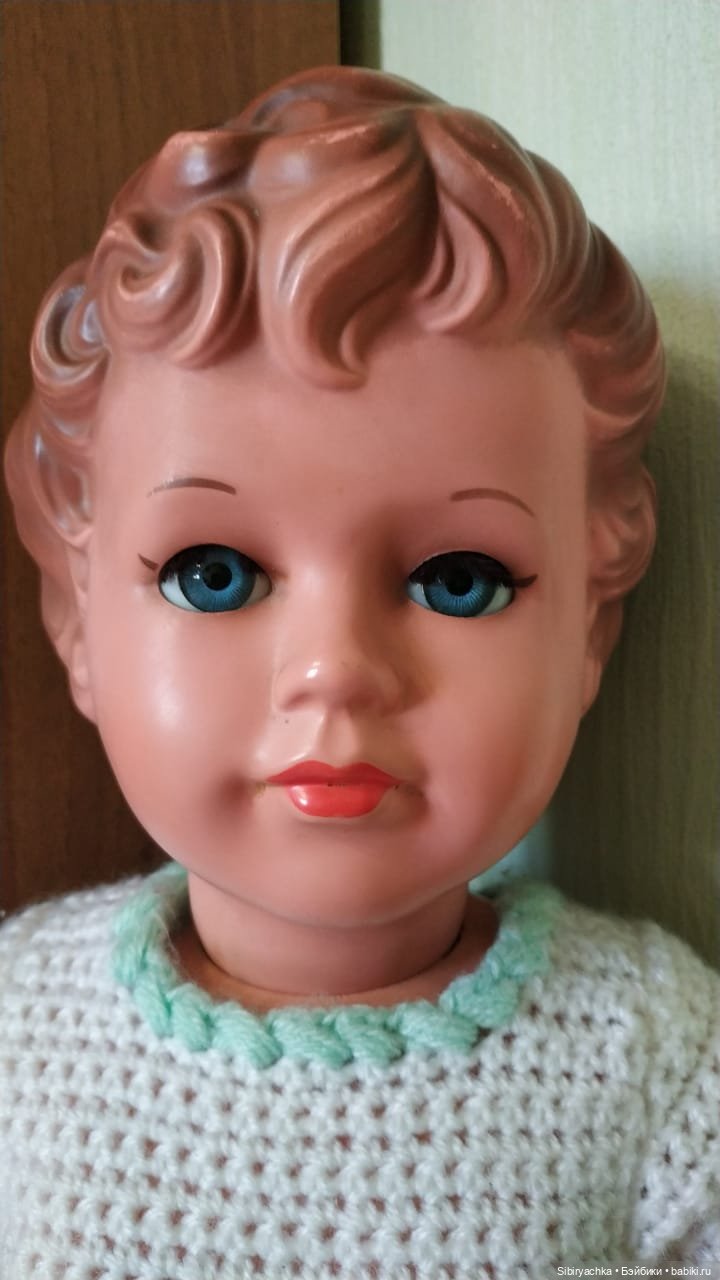 Сегодня мне хочется познакомить Вас с немецкой целлулоидной куклой компании Шильдкрет (Schildkrot). Девочка довольно старенькая, выпущена она в 1950гг. Оригинальное имя у неё Габриэль. Красивое имя, никто не спорит, но девочка по секрету сказала, что хочет быть Надей, Наденькой Надюшей. Итак, она звалась Надеждой. Наденька — девочка высокая, её рост 64 см. Мне очень нравятся ярко-синие глаза Нади, которые не утратили свой блеск за столько лет. Мягкие ресницы немецких кукол очень отличаются от привычных мне пластмассовых ресниц советских девочек. Несомненным достоинством Наденьки является её рабочий пищик, который издаёт протяжные звуки при наклоне куклы. Ни у одной моей советской куклы пищик не работает. У девочки два клейма: одно на шее (черепаха в ромбе), а другое сзади на шее (64 — рост куклы).