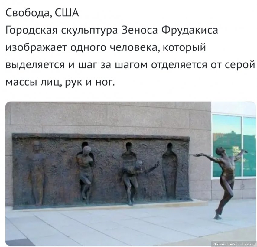 7. Вырвись из своего шаблона, Зенос Фрудакис, США. Скульптура “Свобода” находится в Филадельфии — она символизирует борьбу с тем, что сдерживает нас. Каждый может трактовать мысль по-своему, ведь проблемы и страхи у всех разные. Но в любом случае это произведение искусства напоминает о том, что все могут вырваться из плена, как и этот бронзовый человек.