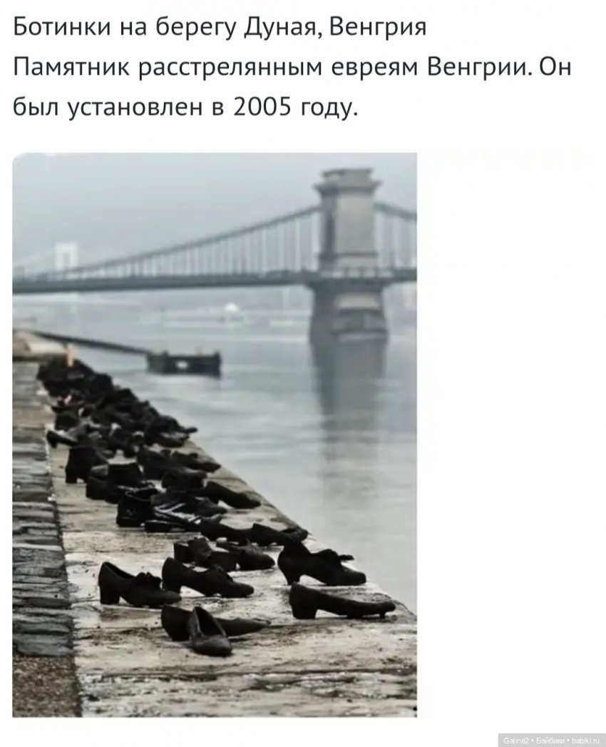 5. Обувь на берегу Дуная, Будапешт, Венгрия. Обувь на берегу Дуная в Будапеште — это дань памяти расстрелянным во время холокоста евреям. В конце Второй мировой войны нацисты, чтобы не заниматься захоронениями, убивали жертв прямо не берегу реку. Но перед этим заставляли снять обувь, которую впоследствии продавали или использовали для собственных нужд. Автором проекта выступил Кен Тогай, а скульптором — Дьюла Пауэр…